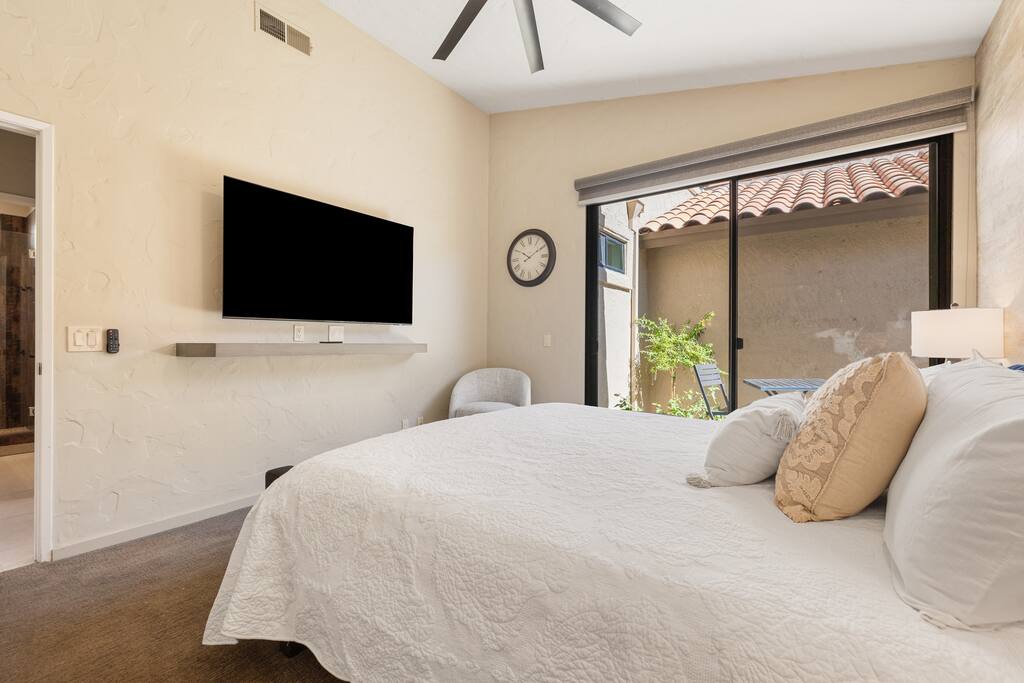 Your Luxurious Desert Escape Awaits Golf cart included in rental! There is a Tesla Model Y that I will include for rentals over 28 days. Step into unparalleled comfort and breathtaking beauty at this luxurious 3-bedroom condo, perfectly situated as an end unit with no neighbors above or to one side, ensuring ultimate privacy and tranquility. You'll find yourself surrounded by plush comforts, from sumptuous linens in each bedroom to two full, spa-like bathrooms designed for relaxation.